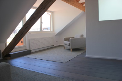 Massivholz Riemenboden mit Nut und Feder. Verschiedene Riemenbreiten. Am Rand mit Fries ca. 20cm breit.