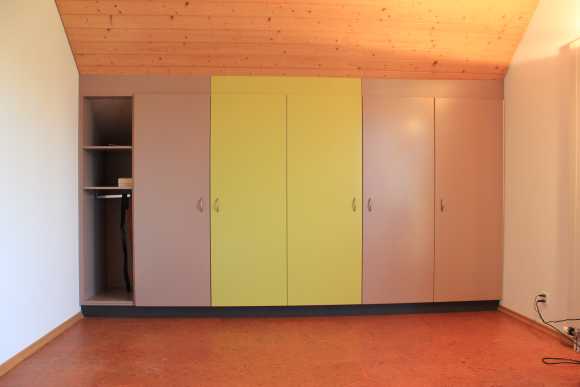 Einbauschrank 5-türig und 1 offenes Fach in Dachschräge eingepasst. Innen Tablare zum Verstellen und Schubladen.