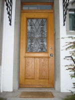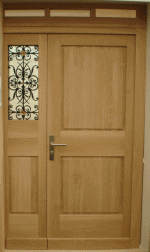 Haustüre Eiche massiv gestemmt mit Füllungen, Doppelfalz und zweifacher Gummidichtung.  Aussen lasiert innen lackiert. Geschmiedetes Gitter von alter Türe übernommen.